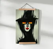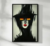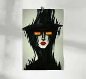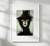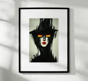 Ein mysteriöses Gesicht, verborgen in dunklen Schatten, mit brennenden Augen, die aus der Dunkelheit hervorstechen. Die kühnen schwarzen Striche verschmelzen mit dem Hintergrund und erzeugen eine fast geisterhafte Präsenz. Die tiefroten Lippen setzen einen markanten Kontrast und verleihen dem Porträt eine fast surreale Eleganz. Dieses Kunstwerk zieht den Betrachter in eine rätselhafte Welt zwischen Licht und Dunkelheit.