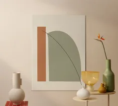Eenvoudige harmonie Dit werk verkent de stille balans die te vinden is in eenvoudige geometrische vormen en een ingetogen kleurenpalet. Het middelpunt van de compositie wordt gevormd door een warme, terracotta boogvorm die doet denken aan een deuropening of een architectonische drempel en die gedeeltelijk wordt overlapt door een geaarde, saliegroene cirkel. Een delicate horizontale lijn en een kleine grijze stip voegen precisie toe aan de verder zachte, organische vormen. Uitgevoerd in een moderne, minimalistische stijl, creëert het een gevoel van vredige stilte en tijdloos evenwicht.