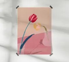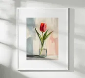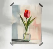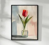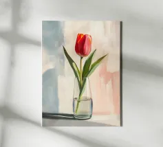 Illustration douce et élégante d’une tulipe rouge et orange délicatement placée dans un verre d’eau. Les nuances pastel du fond ajoutent une touche poétique et raffinée. Une affiche murale idéale pour une décoration florale apaisante et minimaliste.