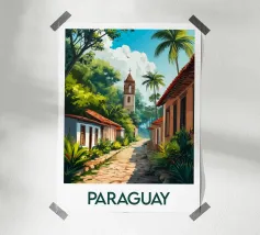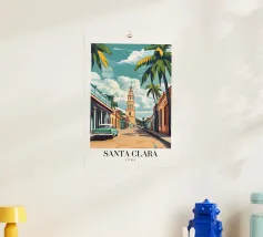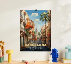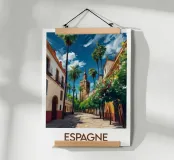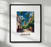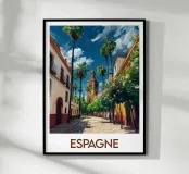 Wandel door de zonnige straten van Spanje met deze poster die een typisch Andalusisch tafereel illustreert, met witte huizen, ranke palmbomen en een historische toren. Een warm, mediterraan tintje voor je muurdecoratie.