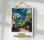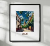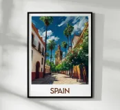 Illustration colorée d’une rue typique d’Espagne bordée de palmiers, avec une architecture andalouse et une tour majestueuse en fond. Une affiche de voyage parfaite pour sublimer une décoration murale inspirée du Sud.