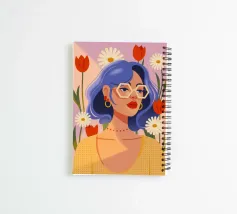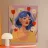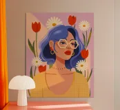 Een opvallend portret van een persoon met blauw haar en een geel topje, omringd door levendige rode en witte tulpen. De gedurfde kleuren en het bloemmotief vieren elegantie en levendigheid.