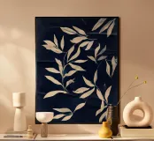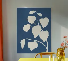 A striking cyanotype-style composition capturing delicate white leaves drifting across a deep indigo field. This piece evokes early botanical photography with a contemporary edge—organic yet graphic, timeless yet modern. Perfect for interiors that lean toward minimalist naturalism or vintage scientific aesthetics.