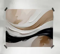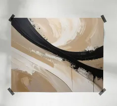 Gebogen bruine en zwarte strepen vegen door de crèmekleurige ruimte in elegante bewegingsbogen.