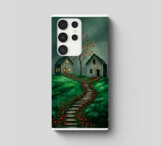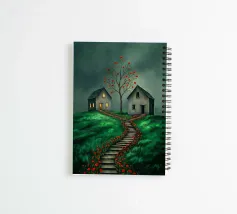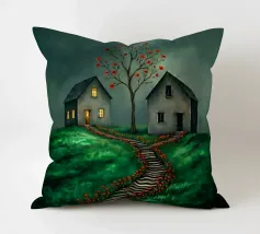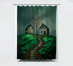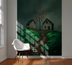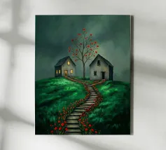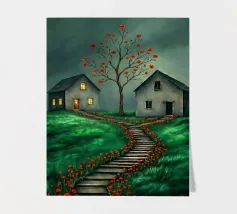 De stenen trap klimt de fluwelen heuvel op, Door klaprozen rood als een vlek op mijn geheugen. De wereld rondom is groen en stil, Een stille droom in de regen. Eén huis ontwaakt met gouden vuur, Een raam dat uitkijkt naar mijn gezicht. Het andere staat in donkere kleding, Een koude en lege, holle plek. Tussen de levenden en de doden, Begint de verwrongen boom te bloeien. Ik loop met zware tred over het pad, Om te vinden welke deur naar mijn kamer leidt.