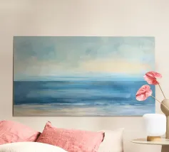 Een abstracte kustcompositie die gescheurde papiertexturen mengt met zachte kleurverlopen van aqua, marineblauw en ivoor. Het gelaagde effect vangt de eb en vloed en roept een rustig zeegezicht op dat perfect is voor moderne en op de kust geïnspireerde interieurs.