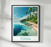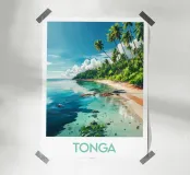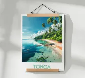 Reisposter over Tonga, met zijn wilde, met palmen omzoomde stranden en kristalhelder turquoise water. Perfect voor een hemelse en exotische wanddecoratie.