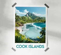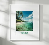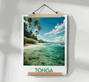 Reisposter die Tonga voorstelt met zijn wilde stranden, majestueuze palmbomen en kristalhelder water met groene en blauwe reflecties. Perfect voor een tropische en exotische wanddecoratie.