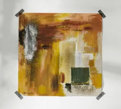 Een abstract kunstwerk met een rustgevende opstelling van vierkante en rechthoekige vlekken in verschillende tinten groen, bruin en beige, die doen denken aan een sereen patchworkveld of een rustig oppervlak met textuur. Bob Nugent-stijl.