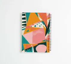 Een abstracte collage met verbrijzelde vormen in een palet van roze en geel, wat doet denken aan een gedeconstrueerde, levendige zon of een warm, energiek landschap.
