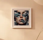 Portretschilderij van een vrouw met golven die over haar gezicht slaan.
