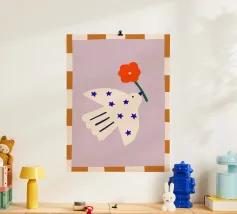 Deze liefdevol ontworpen poster toont een witte duif met bloemen als symbool voor vrede en hoop. De zachte kleuren en grafische strepen geven het motief een rustige, moderne uitstraling. Ideaal voor de woonkamer, kinderkamer of rustige woonruimtes en perfect voor iedereen die zijn huis wil inrichten met een positieve en harmonieuze boodschap.