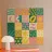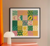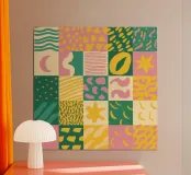 Een vrolijk en kleurrijk patroon dat bestaat uit een raster van vierkanten, elk gevuld met verschillende speelse, geometrische en organische ontwerpen. Het kunstwerk heeft het warme, vrolijke gevoel van een moderne, handgemaakte quilt.