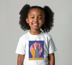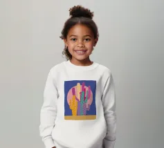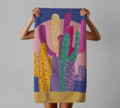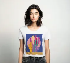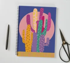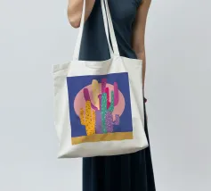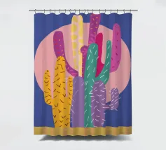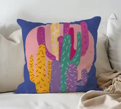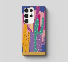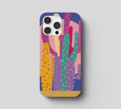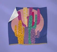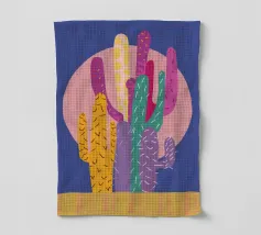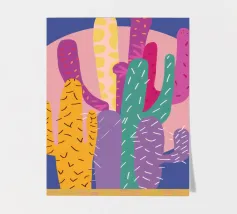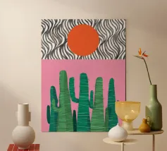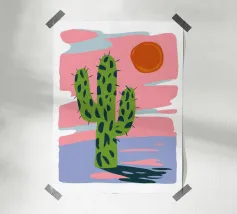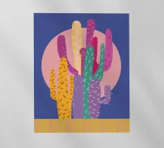 Een mystieke woestijnscène met verschillende cactussen in silhouetten tegen een grote bleke zon en een paarse schemerlucht. De illustratie heeft een magische, serene en licht surrealistische kwaliteit.