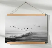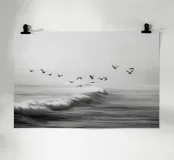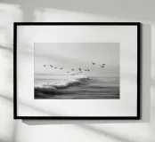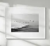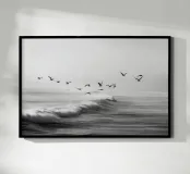 Een opvallende zwart-witfoto van een zwerm meeuwen die sierlijk zweeft boven krachtige oceaangolven. De contrastrijke tinten creëren een dramatische maar serene kustscène, perfect voor een elegante en minimalistische inrichting.