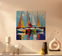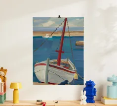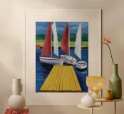 Red and white sailboats rest beside a wooden dock on still water, capturing summer serenity and balance.