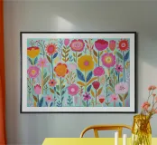 Een levendig botanisch aquarelontwerp met een reeks speelse wilde bloemen creëert een levendige achtergrond voor elk product. Dit bloemenkunstwerk is perfect voor wie energie en persoonlijkheid in zijn stijl wil brengen en is zowel opvallend als veelzijdig.