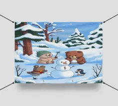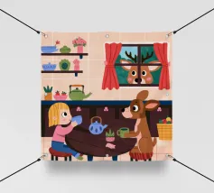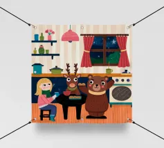 Dit kunstwerk toont een chagrijnige wolk met een gedachtewolkje met daarin een vogel en een beer. Het humoristische en fantasierijke tafereel speelt zich af tegen een zachtblauwe achtergrond.