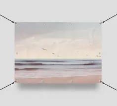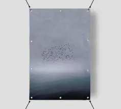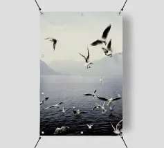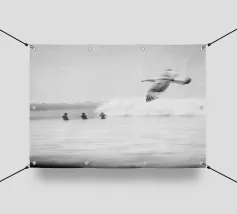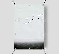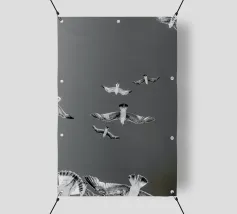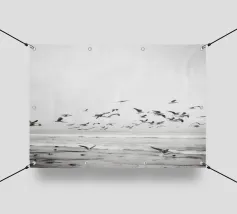 Een opvallende zwart-witfoto van een zwerm meeuwen die sierlijk zweeft boven krachtige oceaangolven. De contrastrijke tinten creëren een dramatische maar serene kustscène, perfect voor een elegante en minimalistische inrichting.