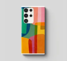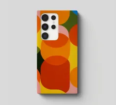 Eine Abstrakte popart Motiv mit 70er Charme zeigt bunte Farbfelder und Muster, in orange-pink-grün. Die Farbige Struktur treffen auf moderne, spielerische Illustrationen im grafischen Design. Lebendig und strukturiert, mit einer klaren, geometrischen Ästhetik.