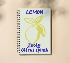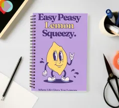 Vrolijke citroen met blauwe bladeren en blauwe letters "SPITZE" op paarse golven. Een humoristisch ontwerp met een positieve boodschap.