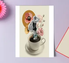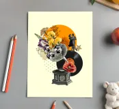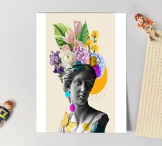Een nostalgische collage die vintage charme combineert met romantische grillen. Een sierlijke grammofoon barst van de levendige bloemen en vinylplaten, terwijl een dansend stel de magie van tijdloze muziek vastlegt. Perfecte muurkunst voor muziekliefhebbers, fans van retrodecoratie of iedereen die zich aangetrokken voelt tot het vertellen van sentimentele verhalen door middel van design.