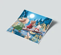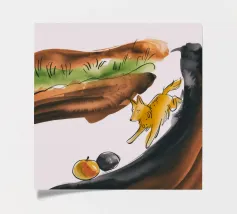 Dit kunstwerk toont een chagrijnige wolk met een gedachtewolkje met daarin een vogel en een beer. Het humoristische en fantasierijke tafereel speelt zich af tegen een zachtblauwe achtergrond.