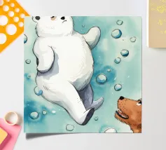 In een grillige tuin houdt een beer een sappige watermeloen vast, omringd door fruit en een weelderige boom. De levendige compositie viert overvloed en de zoetheid van de natuur.