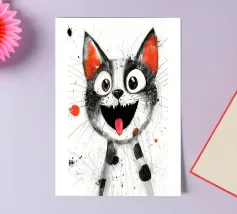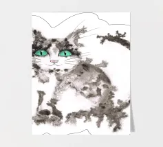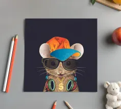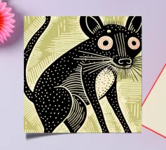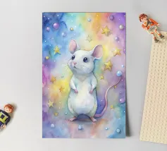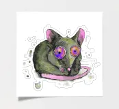 A spotty watercolor drawing of a black rat. Grunge dripping style. He has big purple eyes. He looks at you in bewilderment.