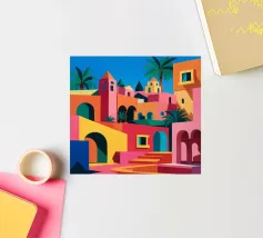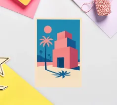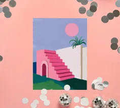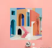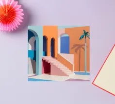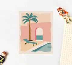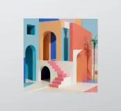 A surreal architectural composition of arches, stairs, and doorways in a soft pastel palette of pink, blue, and beige. A lone palm tree adds a touch of nature to this tranquil and dream like labyrinth.