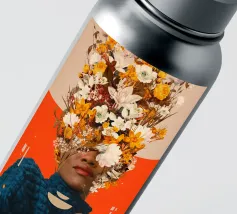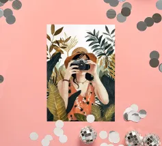 er is een foto in mijn hoofd die elke herinnering aan jou bevat. ~ een vrouw die een oranje jurk draagt met een vintage camera als hoofd levendige oranje achtergrond met retro bloemenelementen.