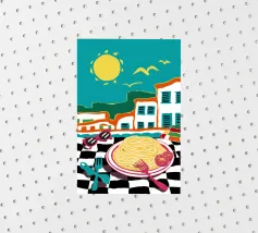 An abstract composition of overlapping, deconstructed shapes in a rhythmic arrangement. The palette of blue, orange, yellow, and nude tones creates a dynamic and harmonious piece with a sense of fluid movement.