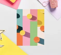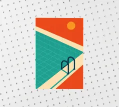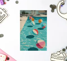 Een moderne, abstracte voorstelling van een zwembad met groen geblokte tegels. Een rode bal drijft op het water en creëert een gevoel van een rustig, zonovergoten moment van ontspanning.