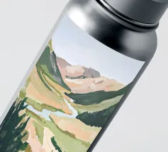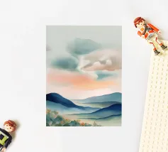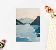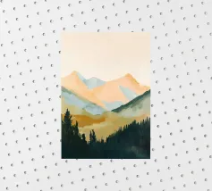 Een minimalistisch olieverfschilderij met een impasto-techniek en krachtige penseelstreken, met groene bergen tegen een lichtgele lucht. Een witte rivier stroomt door de vallei, waarbij het neutrale kleurenpalet een rustgevend effect creëert. De heuvels in de verte zijn zacht getekend en tonen een moderne kunststijl met abstracte vormen en lijnen. De algehele compositie is harmonieus en de zachte verlichting benadrukt het tafereel.