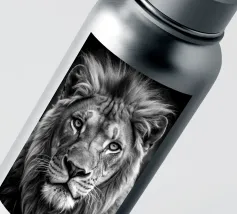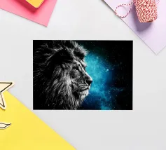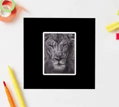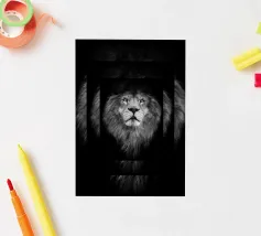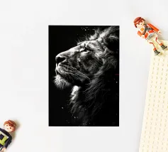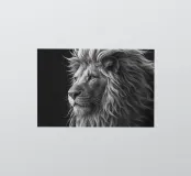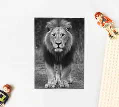 Dit indrukwekkende zwart-wit portret van een majestueuze leeuw toont de indrukwekkende manen en krachtige snuit in een gedetailleerde close-up. De minimalistische compositie en de fijne vachttextuur benadrukken de natuurlijke schoonheid en kracht van dit wilde dier.