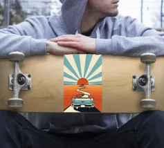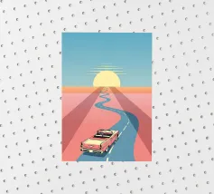 Experience the ultimate freedom and adventure with our vintage artwork. Feel the sun on your skin as you drive along the scenic coastline in a classic convertible. Imagine the wind in your hair as a carefree skater glides by the ocean. This masterpiece captures the nostalgia of a retro road trip and brings you closer to the beauty of an unlimited life. Perfect for any art and adventure enthusiast."