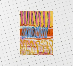 Een abstract kunstwerk dat lijkt op een lappendeken, met verschillende rechthoekige kleurvlakken: blauwe en witte verticale strepen, effen groen en licht geelgroen, mogelijk een gestileerd kustlandschap.
