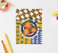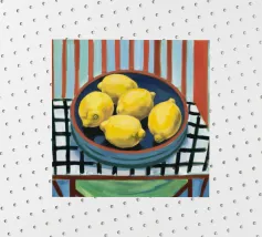 Een uitnodigend stilleven op een helderrode tafel, met een schaal citroenen en een blauwe vaas met delicate witte bloemen. De warme gele achtergrond versterkt de gezellige en levendige sfeer.