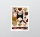 A balanced composition with shells and organic shapes in warm earthy tones. The work shows quiet harmony through color and form.