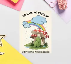 Een levendige en grillige scène met een felroze kikker bovenop een rode paddenstoel met witte vlekken, omringd door weelderig gebladerte en gloeiende bloemen in een mistig, betoverend bos. De magische sfeer versterkt de surrealistische schoonheid.