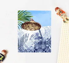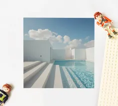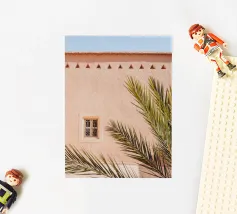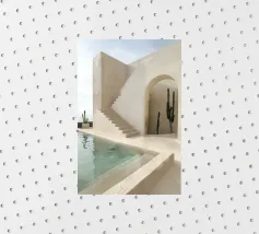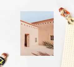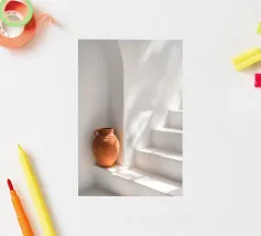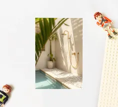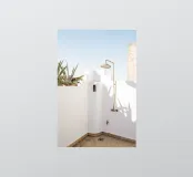 Ontsnap naar een bohemien paradijs met deze prachtige foto van een witte buitendouche op een zonovergoten dak in Marrakech. Het minimalistische ontwerp met zijn strakke lijnen en natuurlijke texturen past perfect bij de warme Marokkaanse zon en creëert een oase van rust hoog boven de stad. Omringd door witte muren en terracotta tegels en een zacht briesje, roept deze serene ruimte een gevoel van vrijheid en ontspanning op. Dit beeld is ideaal om je huis te voorzien van de relaxte elegantie van de Marokkaanse stijl en weerspiegelt de schoonheid van het buitenleven en de tijdloze charme van Marrakech.