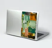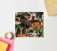 Een abstract kunstwerk met een rustgevende opstelling van vierkante en rechthoekige vlekken in verschillende tinten groen, bruin en beige, die doen denken aan een sereen patchworkveld of een rustig oppervlak met textuur. Bob Nugent-stijl.