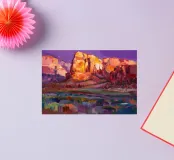 Diep violette en paarse schaduwen vullen een dramatische canyon van rode rotsen. De felle, contrasterende kleuren vangen het intense licht en de stemming van het woestijnlandschap in een moderne, expressieve stijl.