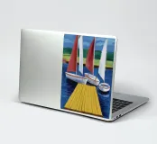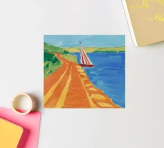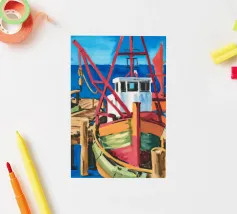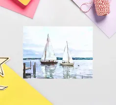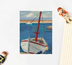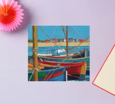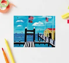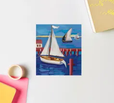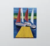 Red and white sailboats rest beside a wooden dock on still water, capturing summer serenity and balance.