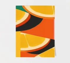A graphic, pop art style pattern of orange slices against a dark blue background. The composition is modern, vibrant, and a fresh, zesty, and stylish design.