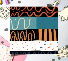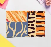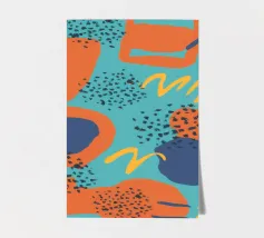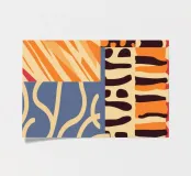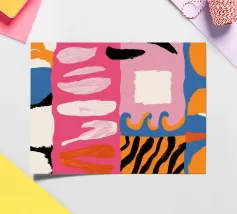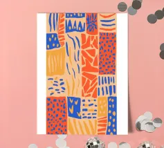 Een abstract kunstwerk samengesteld uit verschillende gestructureerde patches, waaronder dierenprints en effen kleuren zoals oranje en blauw, waardoor een visueel interessant en harmonieus modern patchwork ontstaat.