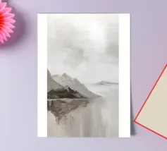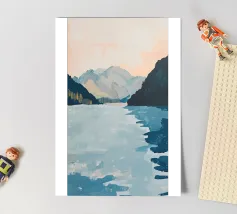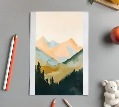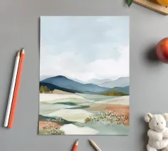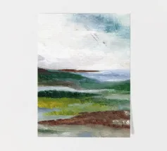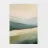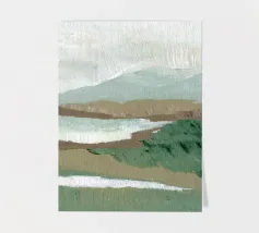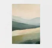 Een minimalistisch olieverfschilderij met een impasto-techniek en krachtige penseelstreken, met groene bergen tegen een lichtgele lucht. Een witte rivier stroomt door de vallei, waarbij het neutrale kleurenpalet een rustgevend effect creëert. De heuvels in de verte zijn zacht getekend en tonen een moderne kunststijl met abstracte vormen en lijnen. De algehele compositie is harmonieus en de zachte verlichting benadrukt het tafereel.