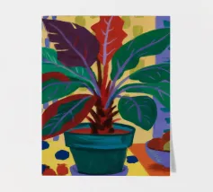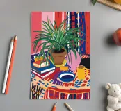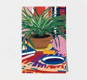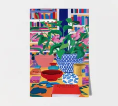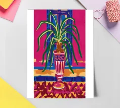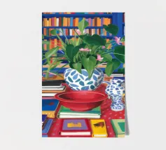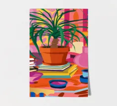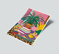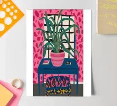 Een stilleven van een potplant en andere objecten op een tafel met een kleurrijk, gedessineerd tapijt eronder. De compositie tegen een roze muur is modern, eclectisch en zit vol charmante, decoratieve details.
