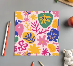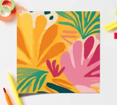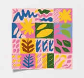 Een speels en energiek patroon van geometrische en organische vormen, gerangschikt in een kleurrijk patchwork- of quiltachtig ontwerp. Het kunstwerk is een vrolijke en levendige viering van kleur en vorm.