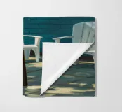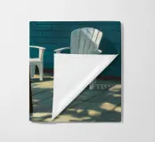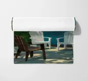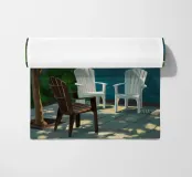 Twee witte adirondackstoelen staan in een zonnige tuin en werpen lange, donkere schaduwen. De compositie is een eenvoudige maar krachtige studie van de zomer, ontspanning, licht en schaduw.